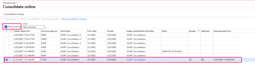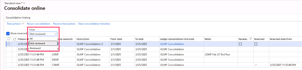 By default, the Consolidation history shows records that are “Not reviewed”.