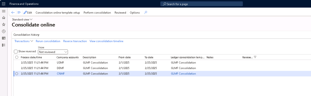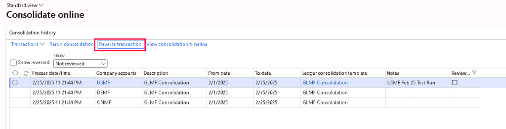 Note that the “Rerun consolidation” and “Reverse transaction” button can only be ran for one historical record at a time.