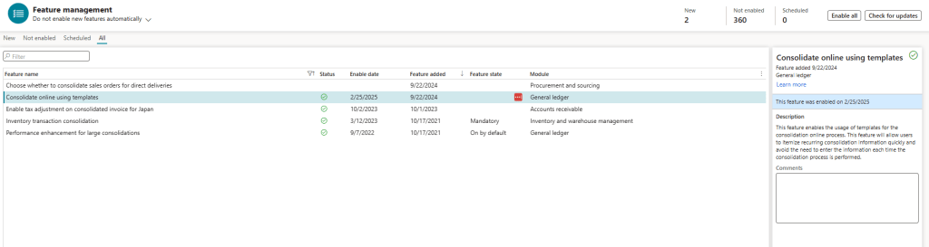 To enable the feature, navigate to Feature management and search for the “Consolidate online using templates” feature.