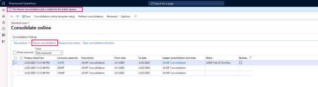 If the consolidation needs to be reran without any changes on the parameters, user can click on the “Rerun consolidation” button. After clicking the button, there will be a notification saying “The Rerun consolidation job is added to the batch queue”.
