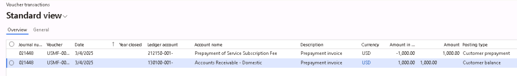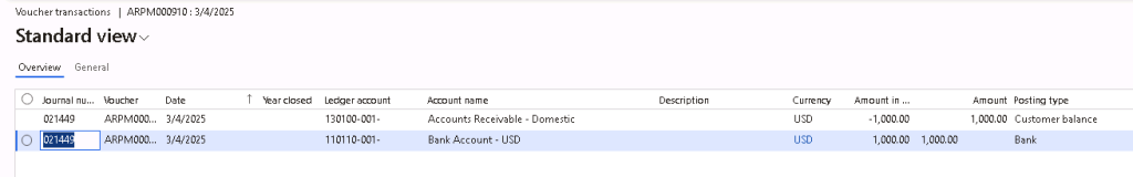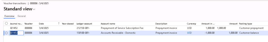 Once the automated process for “Automated prepayment settlement posting” has ran, a voucher will be posted to apply the prepayment to the final sales order invoice and the balance will be updated to the remaining amount owe for $900.