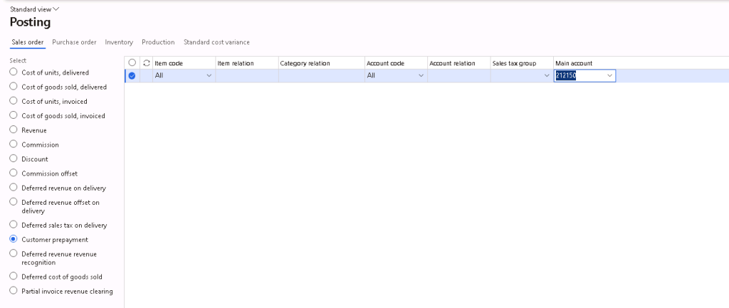 Navigate to Inventory management > Setup > Posting > Posting, under the Sales order tab > Customer Prepayment and enter the posting account for the prepayment.