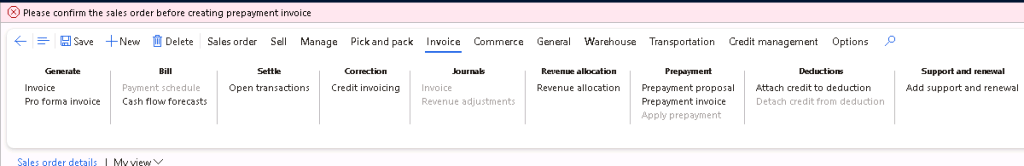 Back on the Sales Order, the Prepayment invoice field on the ribbon (Invoice > Prepayment > Prepayment invoice) will now be enabled. Click on the Prepayment invoice field.