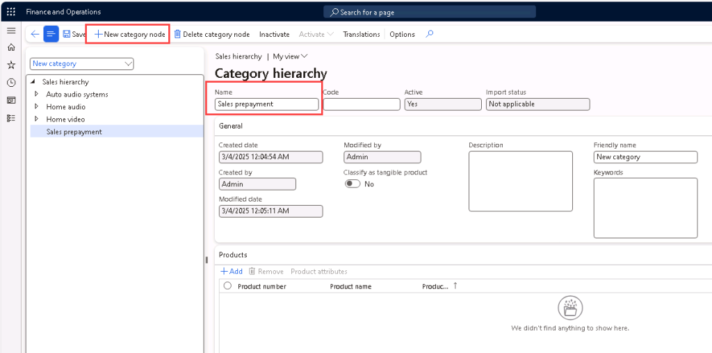 Navigate to Sales and marketing > Setup > Categories > Sales categories, click on Edit category hierarchy. Then, create New category node. Name it as Sales prepayment and Save it.