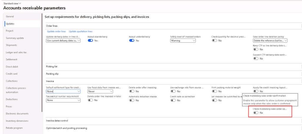Navigate to Accounts Receivable > Setup > Accounts Receivable Parameters, under the Updates tab > Invoice section, select if “Check mandatory sales order confirmation” should be Yes/No. If this field is “Yes”, then customer prepayment invoice can only be created when the sales order is in “Confirmed” status.