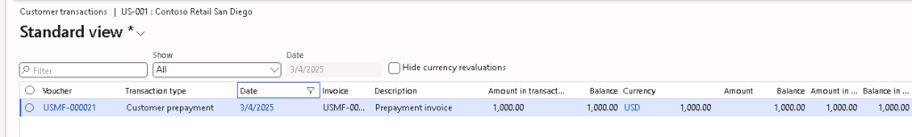 | The customer balance does not reflect the prepayment amount received from the customer | The customer balance reflects the prepayment amount received from the customer until it is applied to the customer invoice. |
