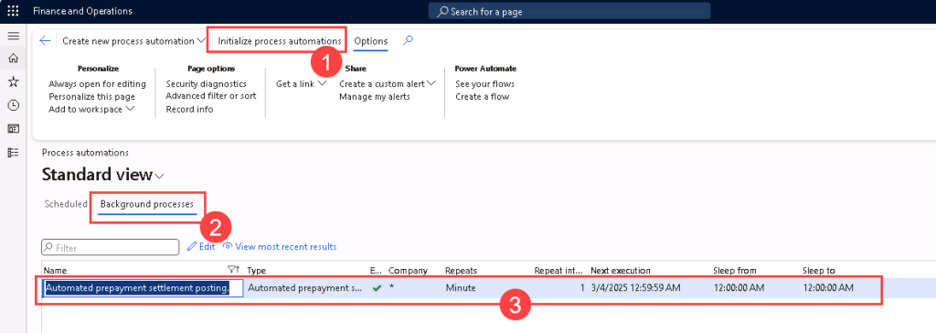 Navigate to System administration > Setup > Process automations, click on Initialize process automations. Then, click on Background processes tab > search for Automated prepayment settlement posting > Update interval to 1 minute.