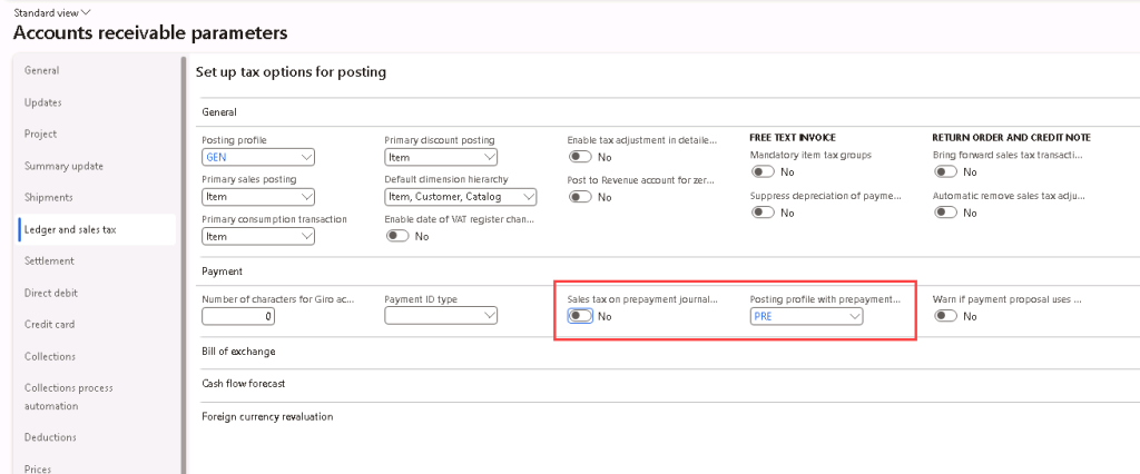 Navigate to Accounts Receivable > Setup > Accounts Receivable Parameters, under the Ledger and sales tax tab > Payment section, set the Posting profile with prepayment journal voucher with the posting profile created in the previous step for prepayment.