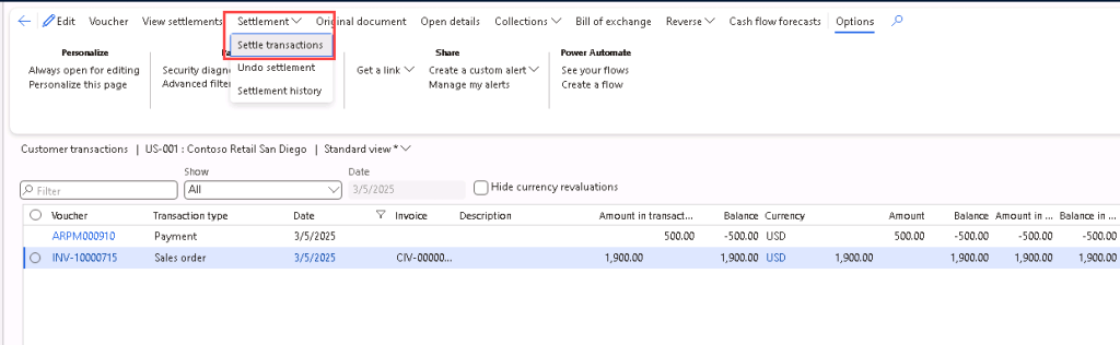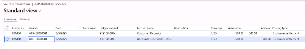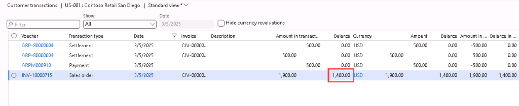 The settlement voucher will be posted on the customer transactions and the sales order invoice balance will be updated to the amount owe after applying the prepayment invoice.