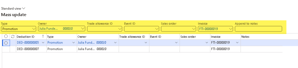 Select the deductions that needs to be mass updated, and click Maintain > Mass update.