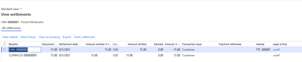 2. For deductions created through Deduction Workbench, Customer Settlement Form, or Customer Page with claim journals posted, and with invoice attached and settled: