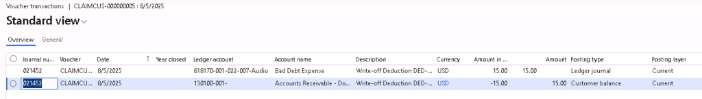 It will also post a claim journal to write-off the deduction based on the main account selected on the write-off reason code setup. User will have to manually settle the open customer deduction transactions and apply the write-off to an open transaction (if automatic settlement is not setup).