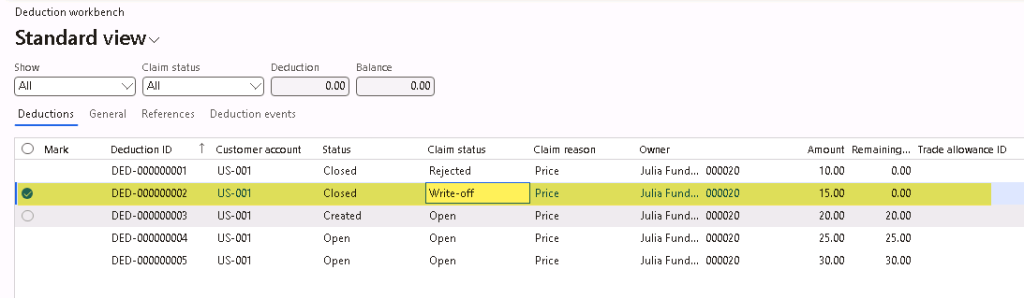 Write-off can be done on deductions that has an “Open” status. Select he deduction line and click on Maintain > Write-off. Then, enter the Write-off reason code. This will update the deduction line status to “Closed” and claim status of “Write-off”.