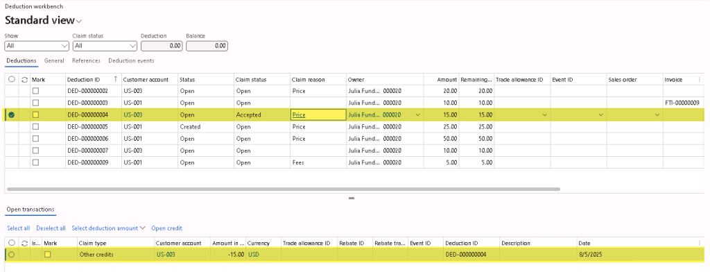After the free text invoice (or return order / negative sales order) is created and posted, the Status of the deduction will be updated to “Open” and the Claim status will be updated to “Accepted”.