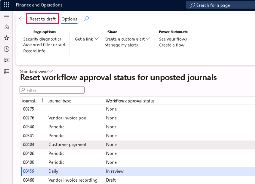 However, in 10.0.41, D365 Finance has enhanced the function and created a self-service repair periodic task that allows administrators to reset the workflow approval status of an unposted journal entry to “Draft” or “Not submitted”.