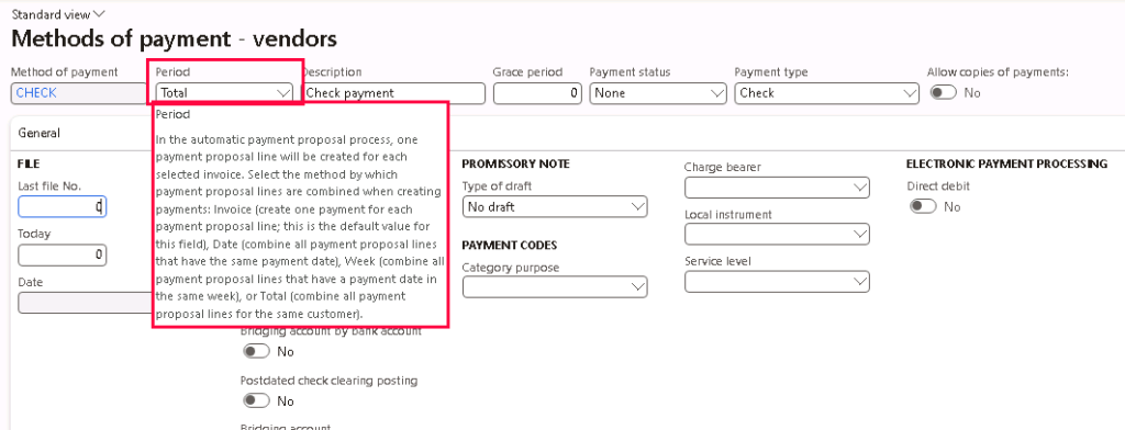 If despite having the Method of payment Period of “Total”, the payment proposal is still not grouping all the payments for the same vendor into 1 payment line, then there might be 7 other contributing factors that are causing the payment proposal to be broken up into multiple payment lines.