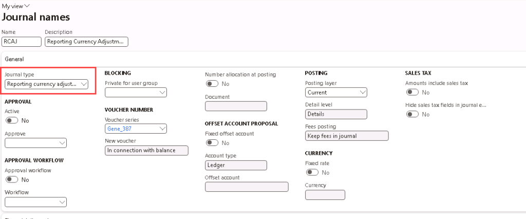 To use the Reporting currency adjustment journal, navigate to General ledger > Journal setup > Journal names to create a journal name for the Reporting currency adjustment journal.