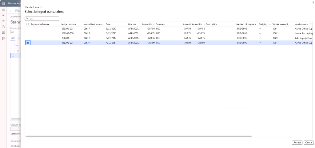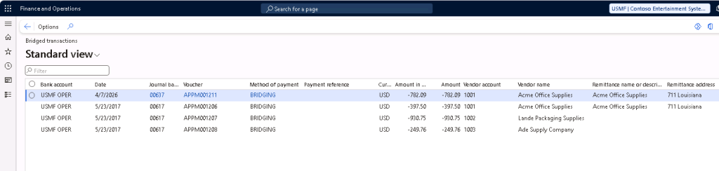 Users can also navigate to Cash and bank management > Inquiries and reports > Bridged transactions to review the bridged transactions report for bridged transactions that were posted but not cleared yet.
