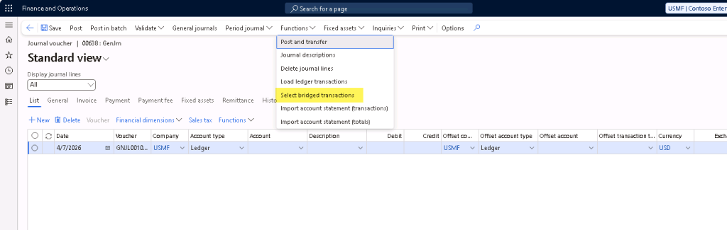 In the journal lines, select Functions > Select bridged transactions.