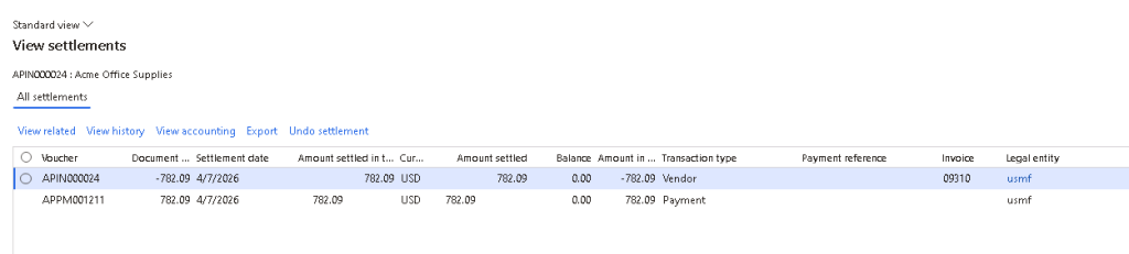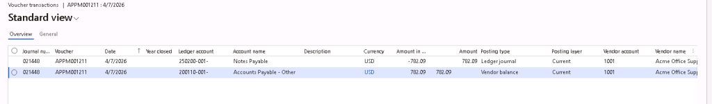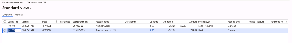 After posting the payment journal, the voucher shows that the payment is offset against the bridging account that was setup previously (250200).