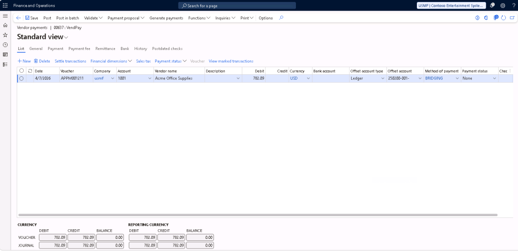 Then, create a vendor/customer payment journal for the payment details and select the Method of payment of “Bridging”.