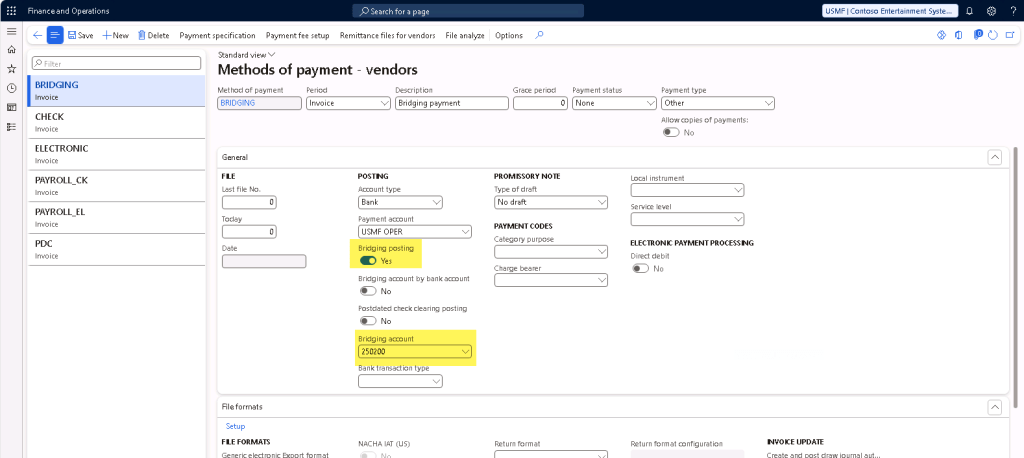 Bridging payments can be setup in D365 Finance in both Vendor and Customer Method of payments (Accounts payable > Setup > Payment setup > Methods of payment or Accounts receivable > Setup > Payment setup > Methods of payment)
